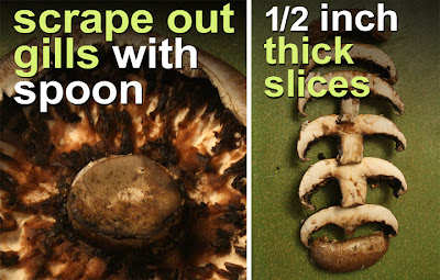 With a spoon scrape out the black fuzzy gills under the mushroom cap. Scrape until you start to see the beige flesh underneath - you don't need to remove every last bit. It's also okay to just slice the portabella mushroom whole, gills and all.