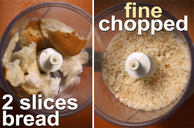 - 2 slices of Bread (about 1/2 cup) - blended or fine chopped. Okay to use packaged Breadcrumbs. Any type of bread will do - even old hamburgers and hot dog buns.