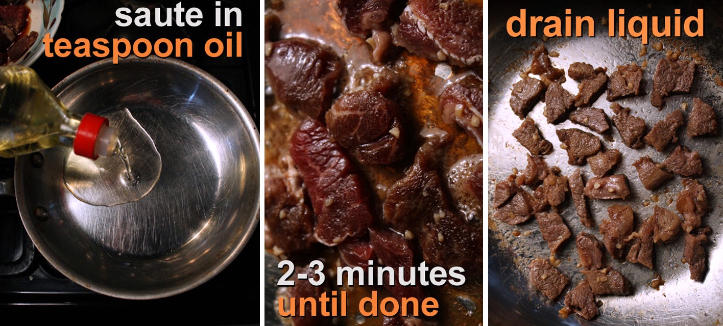 In a frying pan, over medium heat, add 1 teaspoon oil. Saute marinated beef until done, about 2-3 minutes. Drain and remove meat when done. Allow to cool down a couple of minutes.