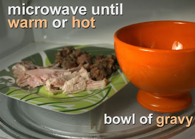 Everybody has their way with Thanksgiving leftovers (click here for a bunch of recipes.) I like nothing better than a plate of microwaved turkey, stuffing, gravy, and veggies, with a side of cold cranberry sauce. If the turkey turned out moist then microwaving is fine, but if your turkey dried out in the oven, then pour on some gravy, or reserved turkey juices, even a teaspoon of water to reconstitute (always remember to save the turkey juices for such an emergency - I always pour some over my sliced bird, dried-out or not.)