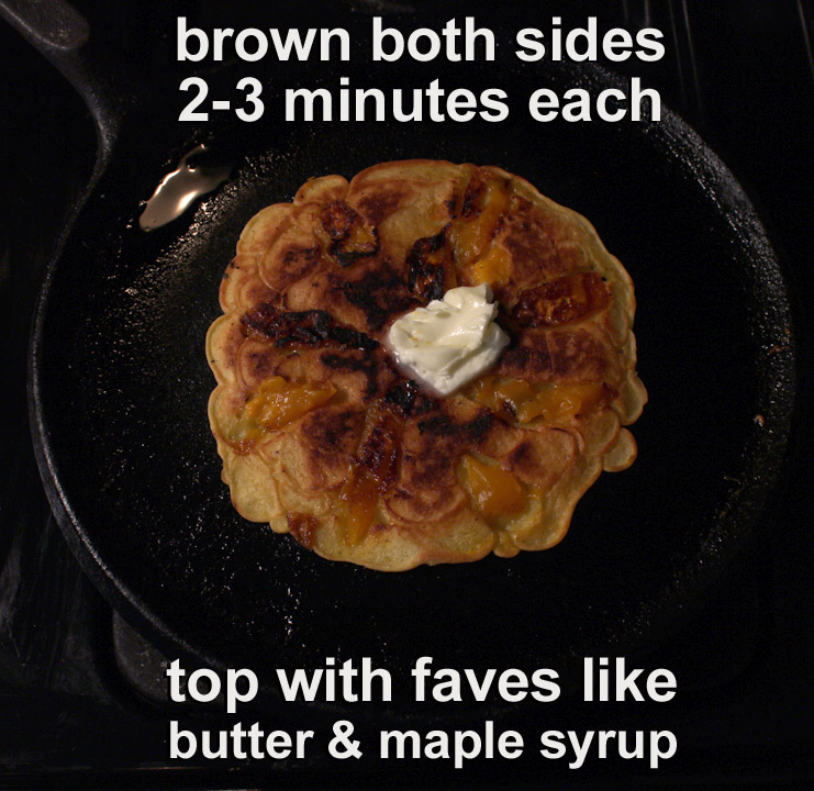 Add oil to pancake pan and pour on the pancake batter with Mango pieces. Brown each side of the pancake. Mine took about 3 minutes for each side. It really depends how hot your pan gets.