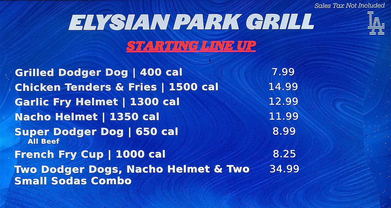At Dodger Stadium in Los Angeles, fans line up for a Dodger Dog. This year they cost $7.99 each. They are extra long, about 9 inches, and come with grill marks. There are condiment stations with hand cranks near concession stands - I like mustard, pickle relish, and onions on my Dodger Dog.