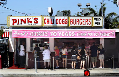 Pink's, L.A.'s most popular hot dog stand (the place can't put up all its celebrity headshots), was started in 1939 with just a pushcart, and has the longest lines of any diner, and deservedly so. It has been filmed and reviewed by every media outlet in L.A. so I won't repeat it all here. However, I did notice one special hot dog that has not been covered, and that is the "Dude."