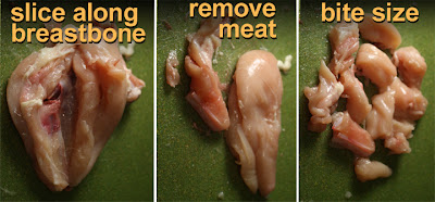 Remove chicken and chicken skin from breastbone. Okay to discard skin, although I like to sautee it with the chicken meat for extra flavor (I would discard skin after meat is lightly browned.) Slice chicken meat into bite-sized cubes. Breast meat is easy to remove, just slice down the length of the center breastbone, and see how nicely the meat comes off.