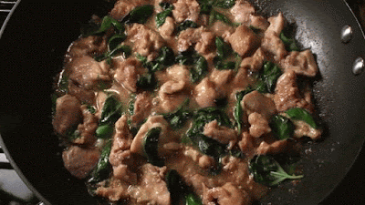When chicken is done add the basil leaves (remove any large stems.) You only need to stir fry less than a minute to soften the leaves.