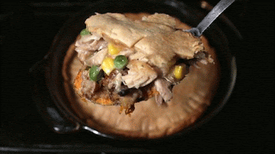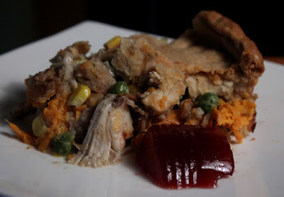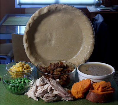 It's simple really, just layer on your holiday leftovers in a deep baking dish then cover it with a cheap store-bought pie crust. When it's done baking (topped with a golden brown crust) spoon out a serving with a side of cranberry sauce.