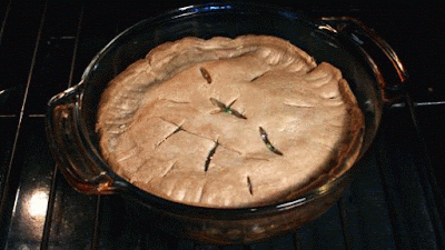 Once you have all the ingredients layered in a deep dish and covered with the pie dough, bake in the oven at 375 degrees for 45 minutes. Check on the pie dough towards the end of baking and remove if it gets too brown.