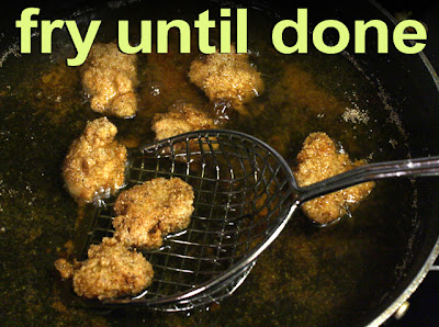 You may need to fry in batches, depending how large the pan or pot is. Carefully add a coated alligator nugget to the hot oil -- it should start frying and bubbling right away (see video.) Add more alligator, but don't overcrowd the frying pan. If you use fish fillets they will cook quicker; no more than a couple of minutes for each side. Alligator takes an extra minute or two longer, about 5 -7 minutes. Done when cooked through and the cornmeal coating is brown.