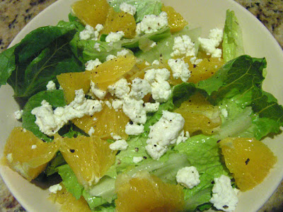 Cut out wedges of orange; add to bowl of roughly torn romaine lettuce. Squeeze out juice from the pulp that remains in the sliced orange, over the lettuce. Drizzle olive oil over salad. Add a small amount of crumbled goat or feta cheese. Freshly ground pepper to taste.