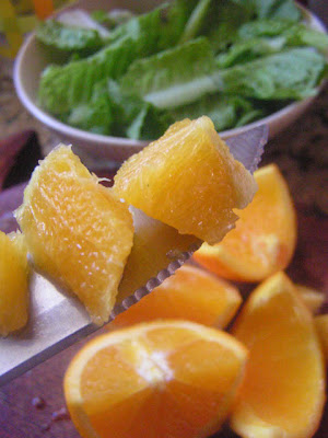 An orange adds enough acidity that mixes well with olive oil. It's a light, simple salad; to lead you into the next few days of heavy holiday dining.