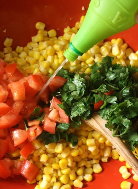 Add chopped tomato and cilantro to the bowl of warm corn. Squirt in a tbsp. of lemon or lime juice. Ready to serve with you favorite entree; or with tortillla chips at a party, picnic or barbecue.