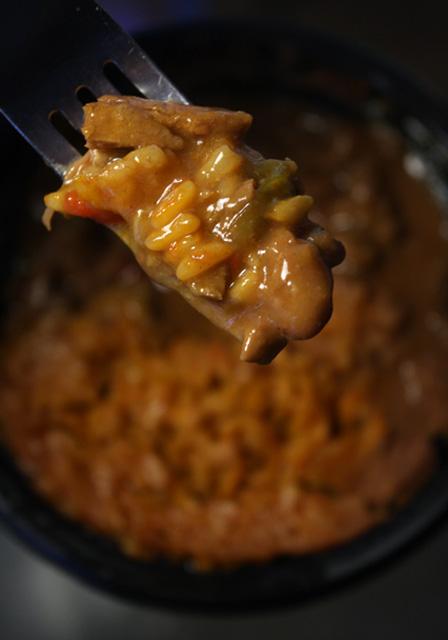 As for the ingredients, the cover shows a lot of red and green bell pepper slices - mine had just a few slivers but that was enough; this is one pungent vegetable that can easily overpower any dish. I especially liked the Mexican-style tomato and salsa rice, made more intense with garlic and onion. But the refried beans were too mushy and mashed; I would have liked a few larger pieces to recognize what I am eating.