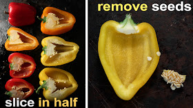 Slice Bell Peppers in half, lengthwise. Remove white membranes and seeds. You can chop off the stem (I usually just leave it on -- it becomes a handle to grab.)