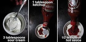 Add 3 tablespoons of mayo or sour cream to a bowl. Squeeze in a tablespoon of ketchup.