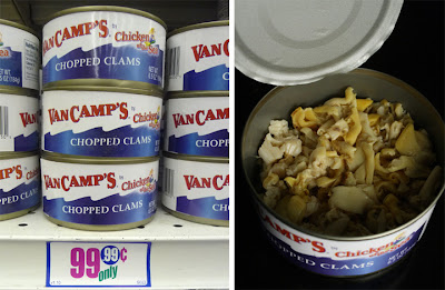 Fortunately, anyone can enjoy my New England Clam Chowder, as all the main ingredients come cheaply: just a couple of 99 cent cans of chopped clams, 2 slices of bacon, a large russet potato, an onion, a pint carton of half & half cream, and some regular milk. I picked up most of the ingredients at this 99c Only Store, but regular markets stock these budget items.