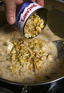 Check chowder from time to time and stir -- don't boil, let it cook at a low temperature. After 45 minutes stir-in chopped clams. Cook uncovered another 5 -10 minutes to heat through. Turn off heat and let it sit a couple of minutes so the chowder will thicken.