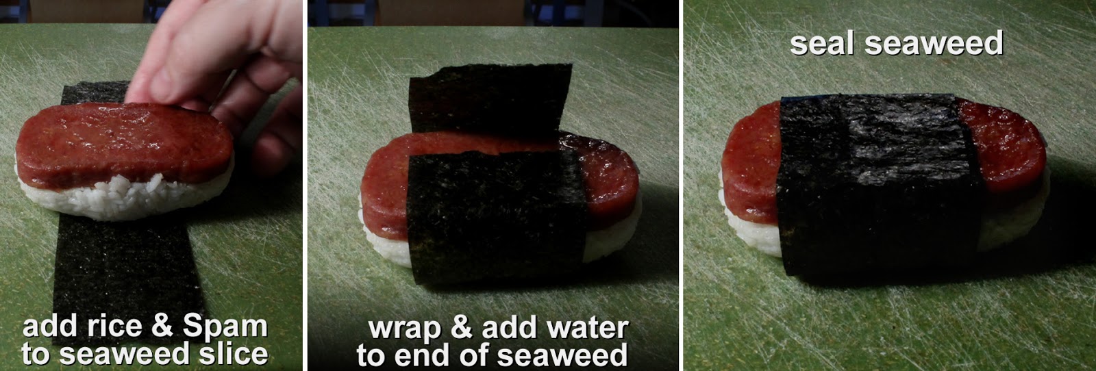The other solution is to have a wide enough piece of dried seaweed that wraps the Spam and Sticky Rice completely, like a sandwich. Some Musubi is normally made this way. While it may seem like a lot of seaweed, it isn't really, since seaweed is very thin.