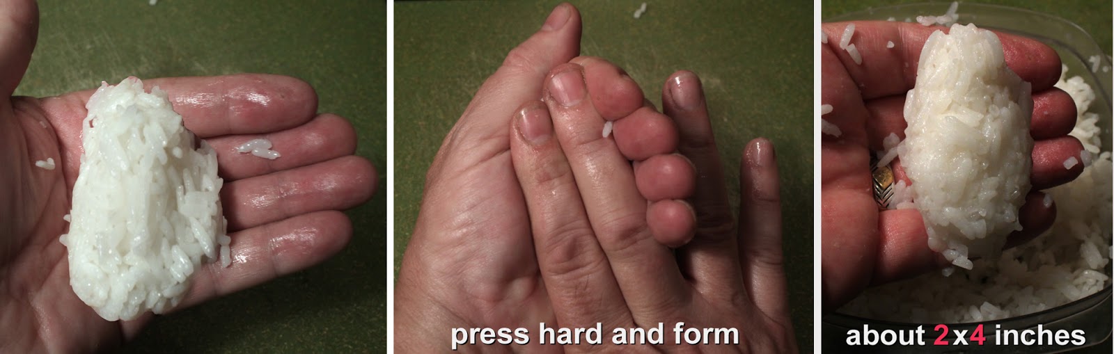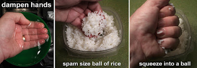 There are several ways to make a Sticky Rice layer. The main thing is you have to press the rice and form it to about the size of a slice of spam, and an inch or two thick block of rice.Watch my video just above the Ingredients lists to see how I do it - in motion.