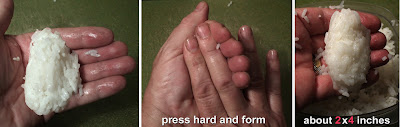 The end result is an oval of rice that is about 2 inches by 4 inches. It doesn't have to be perfect -- a little larger or smaller is