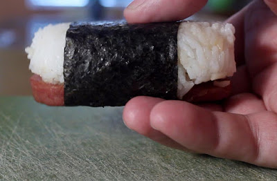 Spam Musubi was originally created by Hawaiian locals who immigrated from Japan. Teriyaki Spam Musubi is simply a Twinkie-size disc of sticky rice tucked underneath a thick slice of sauteed spam in teriyaki sauce, that's wrapped in a thin sheet of dried seaweed. It is a potent portable package that fits in your hand and is usually eaten on the run and anywhere.