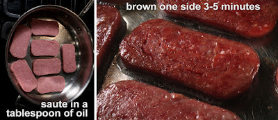 Add tablespoon oil to medium/hot pan. Add spam slices to pan. Brown at least one side, about 3-5 minutes. After one side of Spam is brown, flip it over.
