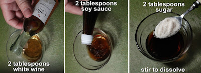 In a small bowl add soy sauce, white wine (mirin or sake) and sugar. Mix to dissolve sugar or favorite sweetener.