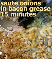 While bacon is cooking chop one whole onion. When bacon is browned remove it. Add chopped onion to about 1/4 cup of the bacon grease. Caramelize onions over a low heat - careful not to burn them, about 15 minutes. When done, set aside.